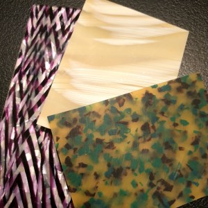 Tout commence avec la fabrication de la plaque d’acétate de cellulose. Elle est composée de fibre de coton ou de bois mélangées à du plastifiant. Le mélange est teinté, effilé, réduit en copeaux colorés puis moulé en plaque colorée par la société DECORACET.